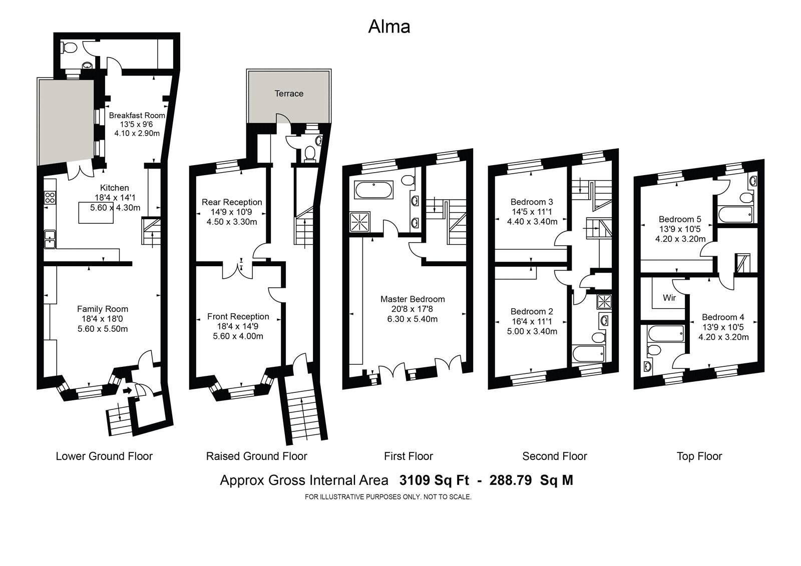 The house is set over five floors and comprises good family accommodation coupled with great reception areas, including a large open plan kitchen / family room / dining room.