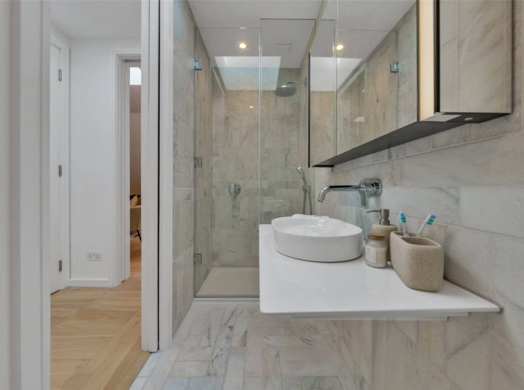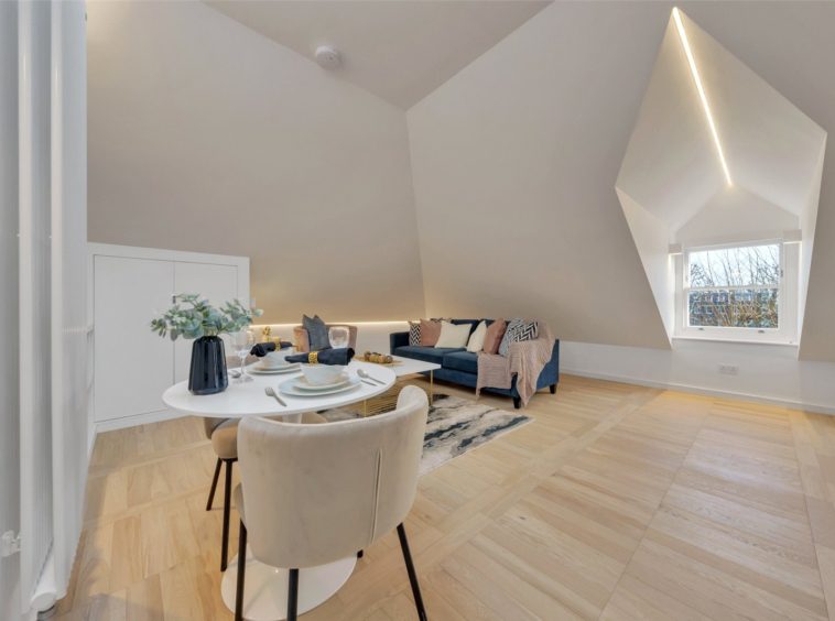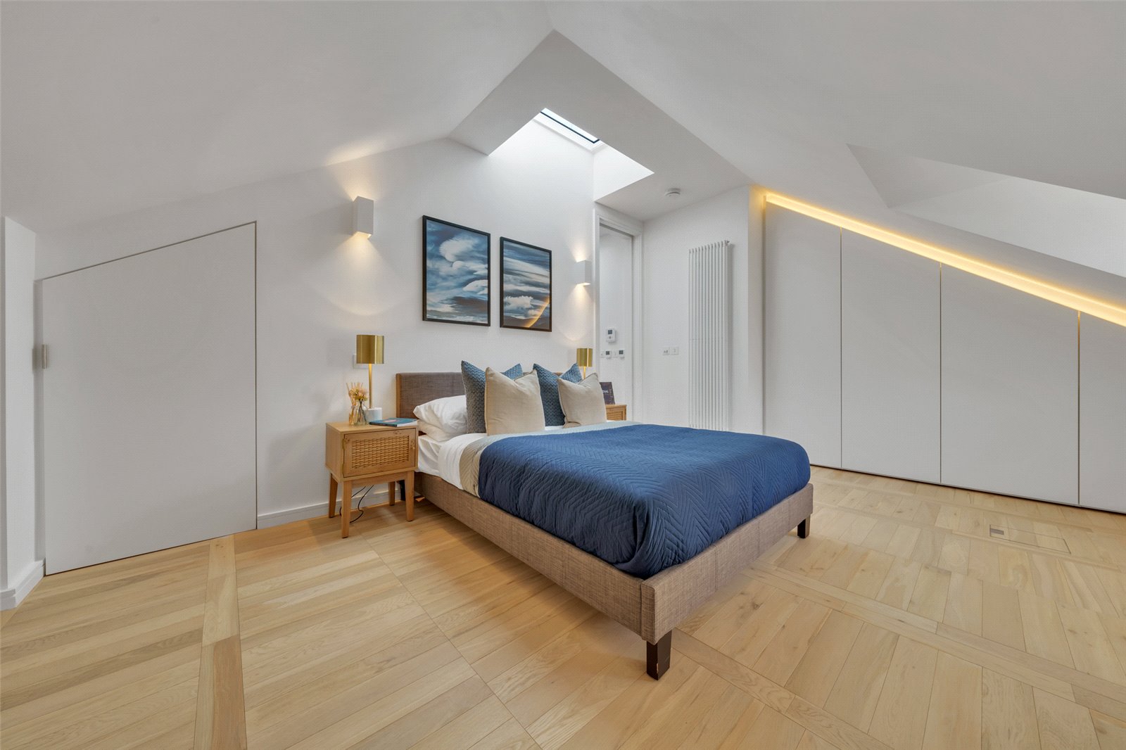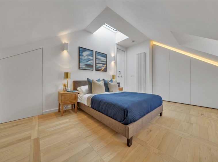The apartment has been custom designed and includes solid oak wood flooring throughout, electric skylights and a bespoke fitted kitchen.