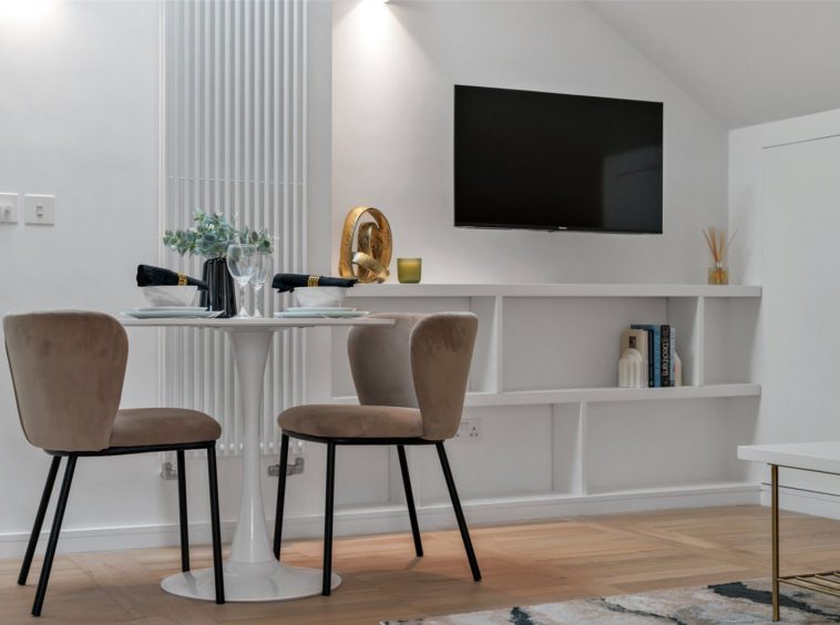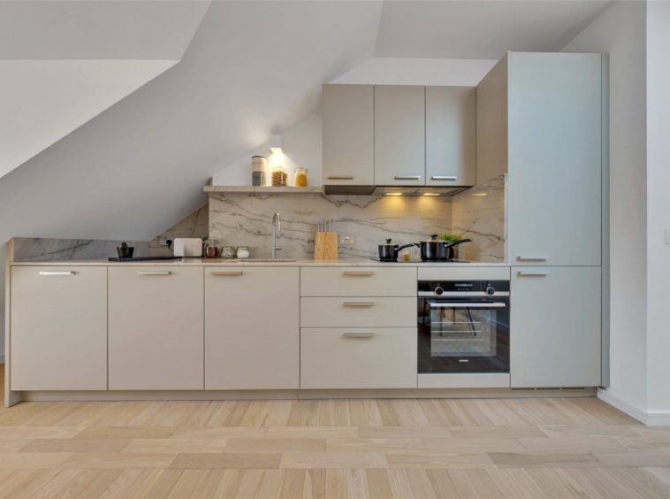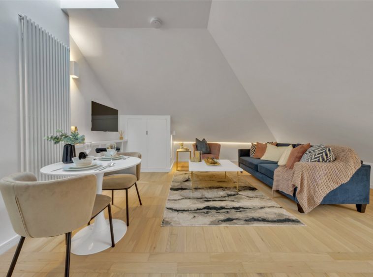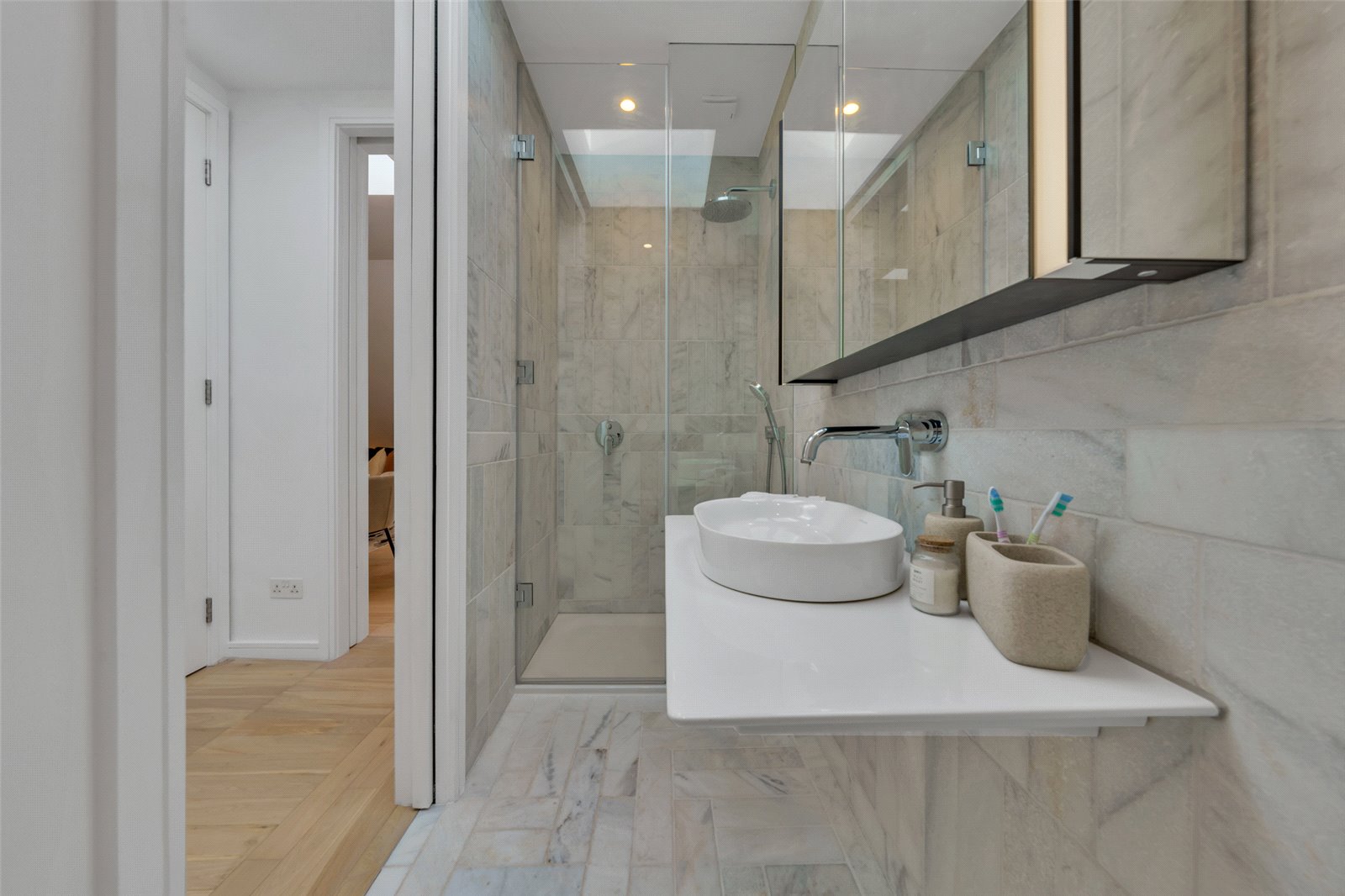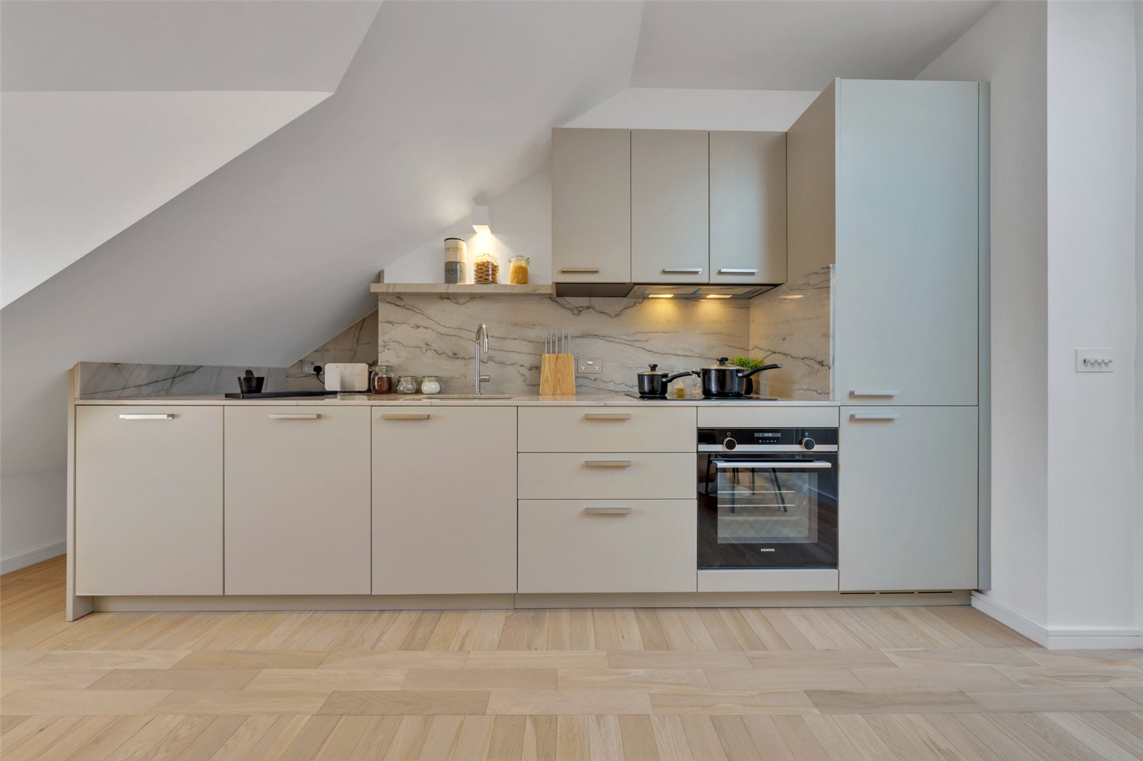 The apartment has been custom designed and includes solid oak wood flooring throughout, electric skylights and a bespoke fitted kitchen.